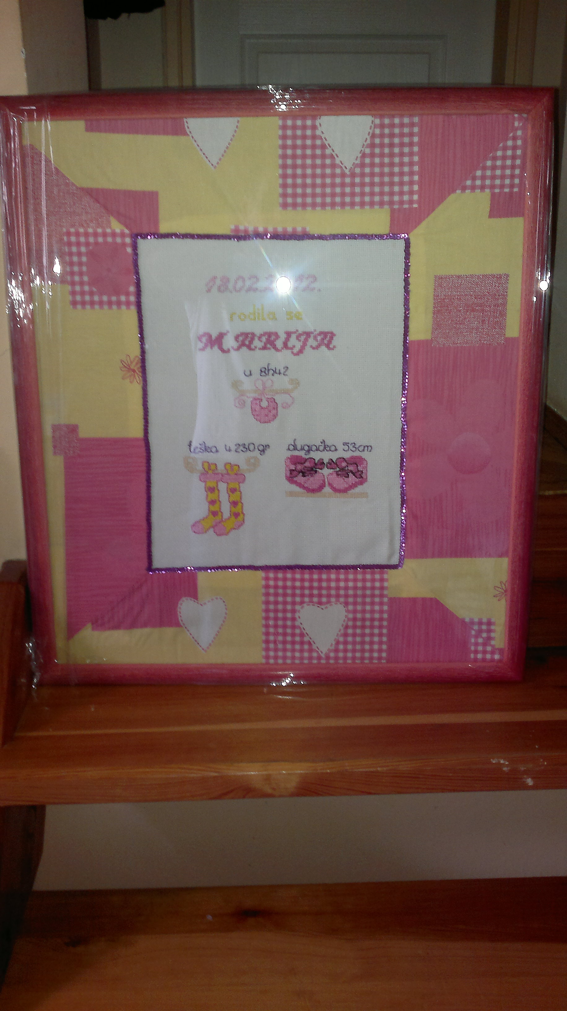 uokviren platnom različitih dezena i uramljen.